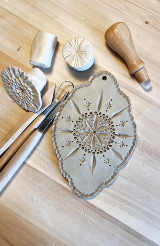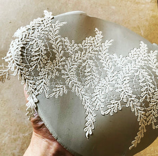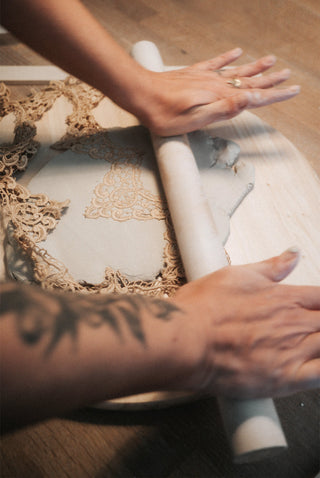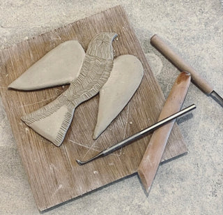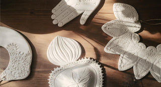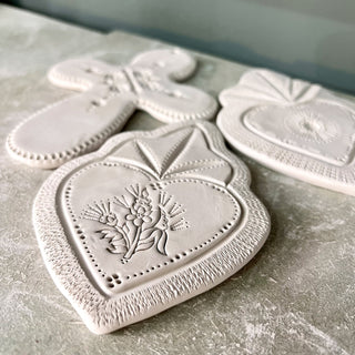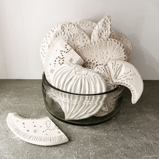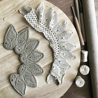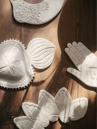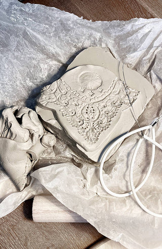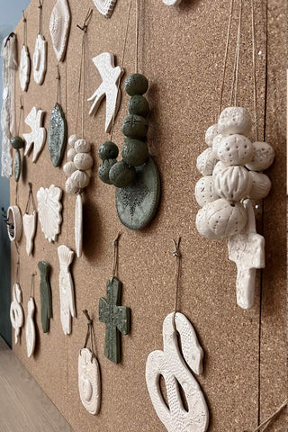 Je réalise chacun de mes bijoux de mur à la main avec de la faïence. Je travaille la terre à la plaque et modèle chaque pièce une à une. Je n'utilise pas de moules car je ne souhaite pas travailler en série.