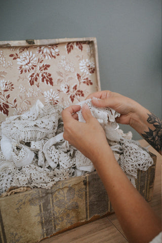 Mon enfance fut bercée par le monde merveilleux et raffiné de ma grand-mère, collectionneuse poétique, dont les tiroirs débordaient de trésors, de magie et de dentelles.